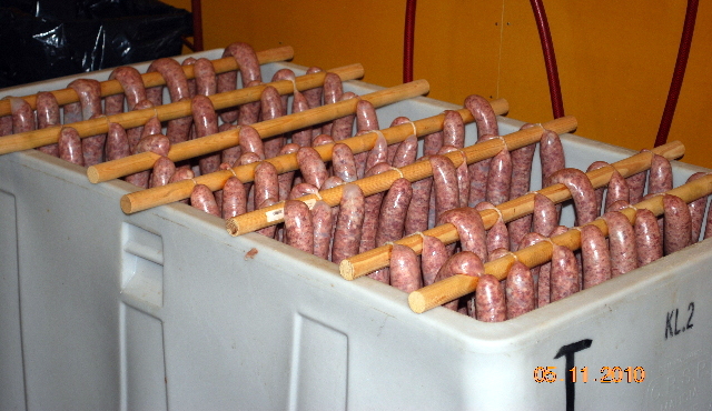 høvelege lengder. Pølsene vert så hengde opp natta over, før dei
